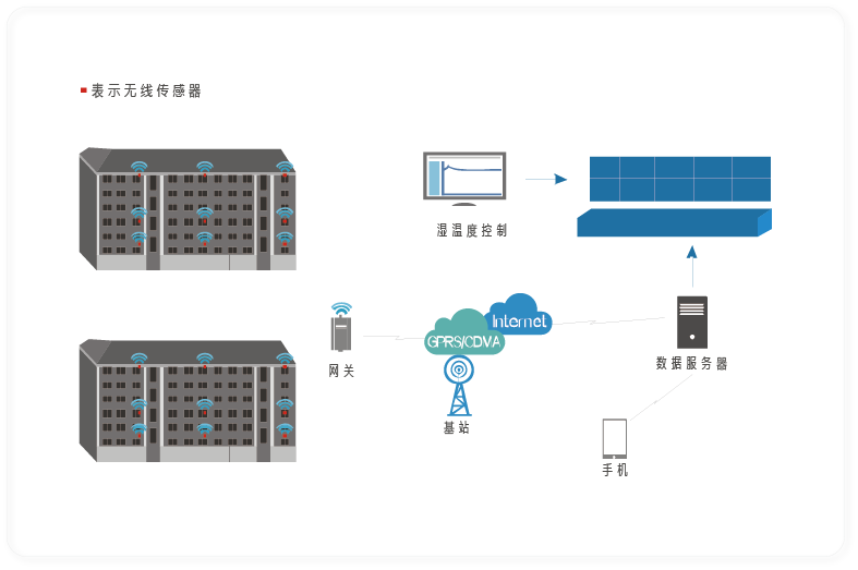 本方案對供暖系統中各點進行實時溫度監測,實現了供暖系統的溫濕度監測智能化、信息化。居民室內安裝無線溫度傳感器,周期性采集環境溫度數據并上報到網關,再由網關通過GPRS或CDMA方式上傳至互聯網中的